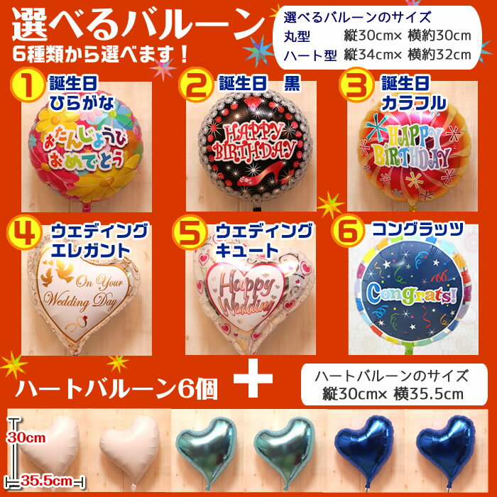 ギフト対応 6つのハートの浮き型バルーン 6つのハート型バルーンと選べるお祝いバルーン1つ、合計7つのバルーンがセットになったバルーンギフトです。
