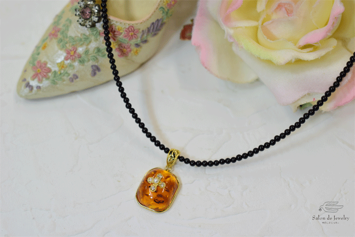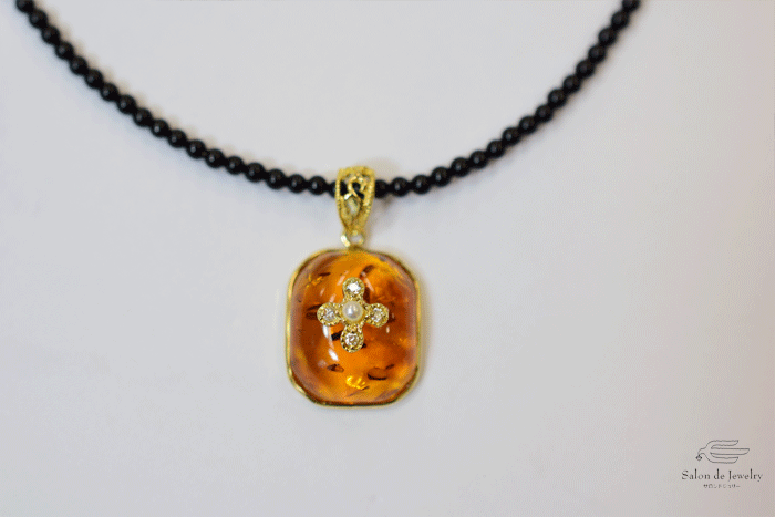 琥珀:約14mm×11mm ダイヤモンド:0.03ct 淡水パール:約1.5mm ネックレス:45cm オニキス2mm丸玉 長さは45cmのプリンセスタイプと呼ばれるもっともポピュラーな長さのネックレスです。