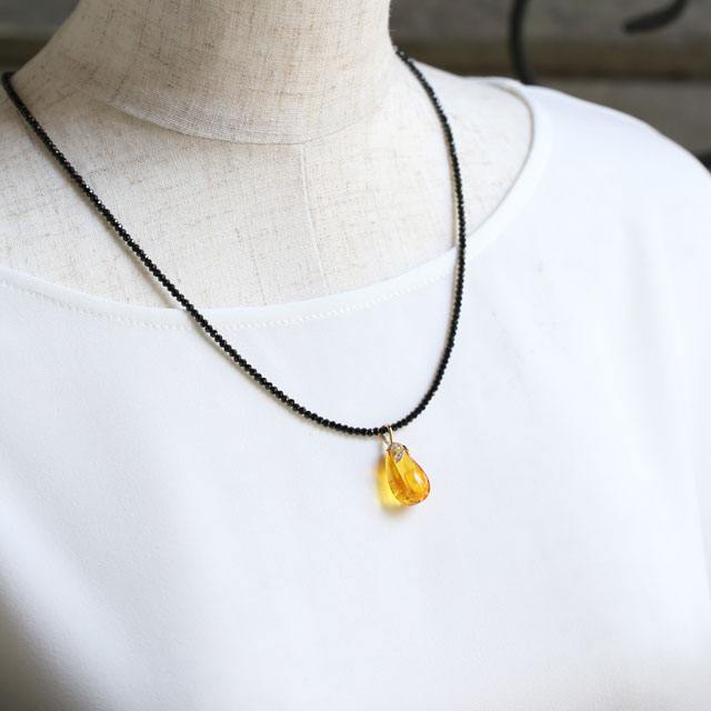 シンプルなドロップ型の琥珀に上品なバチカンをあしらったペンダントネックレスです。