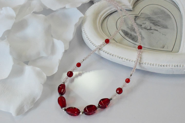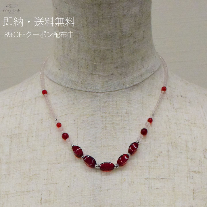 誰もが目を惹く深紅の琥珀と淡いピンクのローズクォーツを組み合わせた大人の女性の為の天然石ネックレスです。