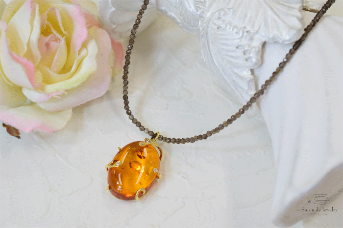 サイズは コハク:約18mm×28mm ダイヤモンド(計3ピース):0.03ct ネックレス:スモーキークォーツ 長さ:50cm 拡大の画像です。